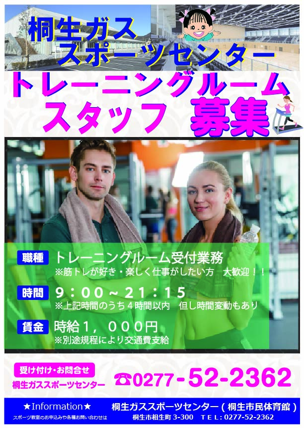 NEWS トレーニングルーム アルバイトスタッフ募集 桐生ガススポーツセンター トレーニングルームアルバイトスタッフ募集!! 〇職種 トレーニングルーム受付業務 〇対象 高等学校卒業以上 〇時間 9:00~21:15(上記時間の内4時間以内 但し時間変動もあり) 〇時給 1,000円 【受付・お問い合わせ】 桐生ガススポーツセンター ☎0277-52-2362
