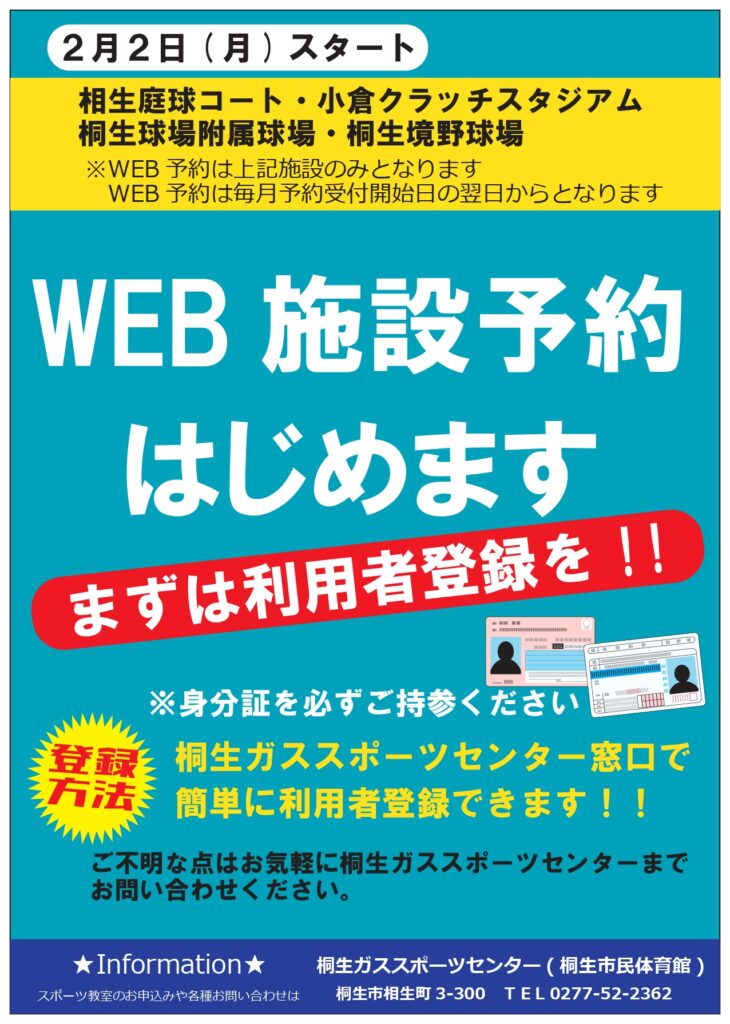 NEWS WEB施設予約はじめます(相生庭球コート・小倉クラッチスタジアム・桐生球場附属球場・桐生境野球場) WEB施設予約はじめます(相生庭球コート・小倉クラッチスタジアム・桐生球場附属球場・桐生境野球場)※WEB予約は相生庭球コート・小倉クラッチスタジアム・桐生球場附属球場・桐生境野球場のみです※WEB予約は毎月予約受付開始日の翌日からとなります ★4月・5月のWEB予約受付は3月3日(火)となります まずは利用者登録を!! 【登録方法】身分証をご持参の上、桐生ガススポーツセンター窓口にお越しください。