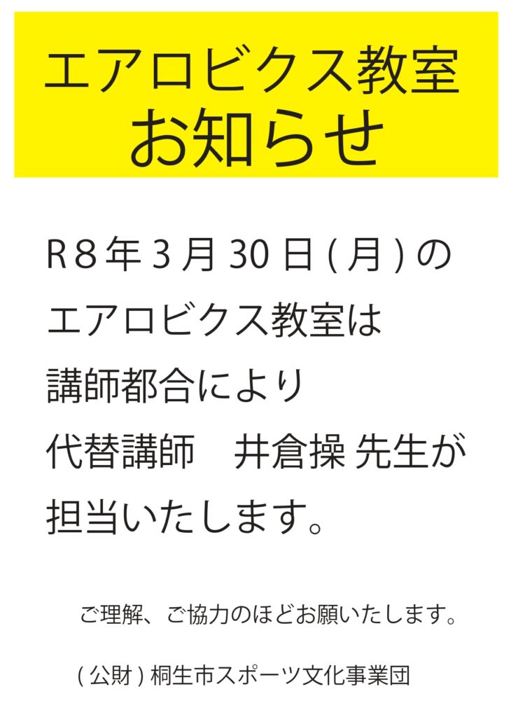 NEWS エアロビクス教室 3月30日(月) 代替講師のお知らせ エアロビクス教室 3月30日(月) 代替講師のお知らせ R8年3月30日(月)のエアロビクス教室は、講師都合により代替講師 井倉操先生が担当いたします。 ご理解、ご協力のほどお願いいたします。 井倉操(エアロビクス・ステップ) エアロビクスインストラクター ステップリーボック公認